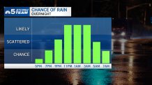 A few showers and storms are possible as early as 5 p.m., but more widespread rain is expected after 9 p.m. The highest chance of rain for all of the Chicago is from midnight to 4 a.m. There’s a chance a few light showers hang around for a few hours after sunrise Friday morning.