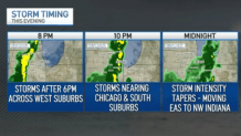 Between 8 and 10 p.m., storms will near Chicago, the lakefront and the south suburbs. By about midnight, storm intensity will taper as the system moves into northwest Indiana.
