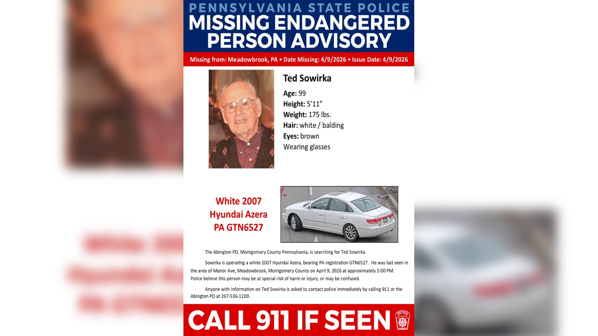 Pennsylvania State Police issued a missing persons alert for Ted Sowirka, 99, who was last seen near Manor Avenue in Meadowbrook on April 9, 2026, around 5 p.m.