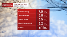 Here’s a look at snow totals from around New York, New Jersey and Connecticut (updated as of 12 a.m. Monday):