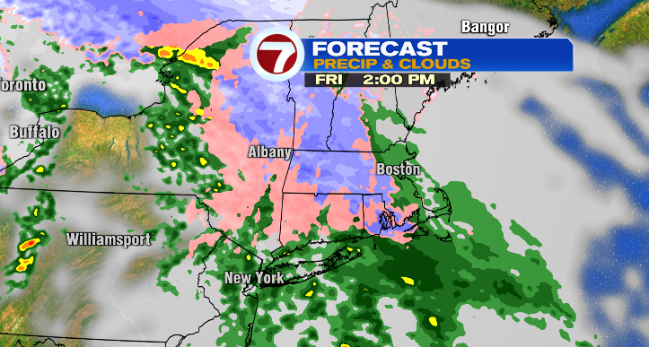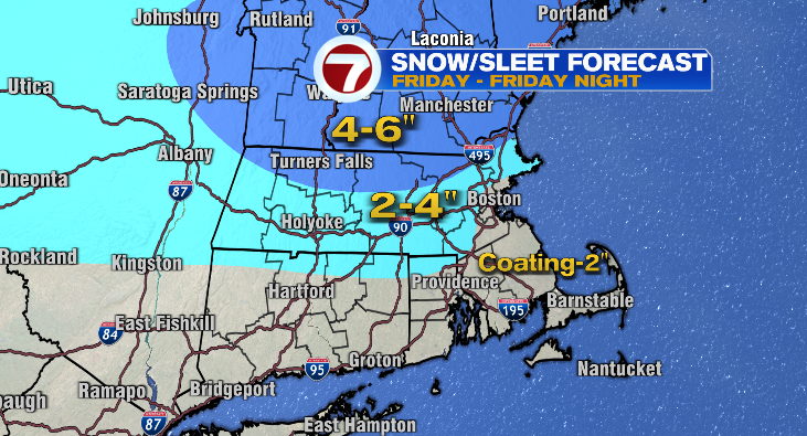 We’ll start with rain/a wintry mix late Friday morning and early Friday afternoon. Areas north of route 2 will switch over to snow first, before areas further south follow suit by Friday evening. Areas along and south of the Mass Pike will have the most mixing, and the least snow, versus areas further north. Towns along and north of route 2 (where the switchover to snow will happen first) have the highest accumulation potential — a widespread 4-6″, with 6+ possible on a localized scale.