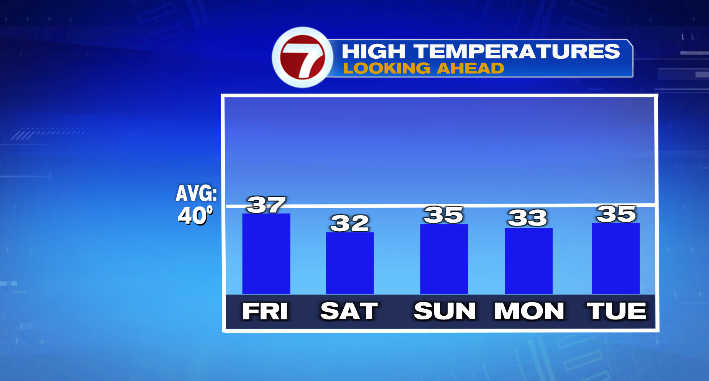 While all of this is happening, temperatures dip a few degrees as well. While it won’t be as frigid as parts of last week were, it will be largely below-average after today. Expect the low to mid 30s through the middle of next week.