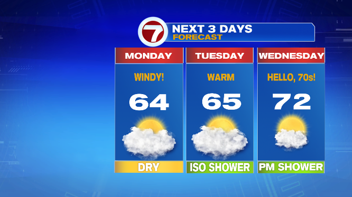 Monday’s highs will be in the mid 60s, as will Tuesday’s. Wednesday looks like the warmest day of all, with highs in the upper 60s and low 70s!