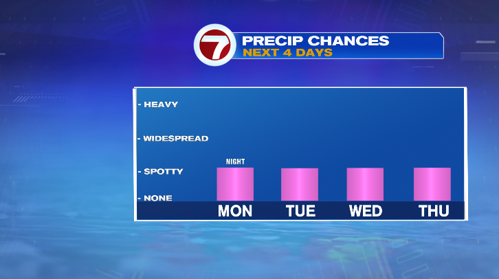 However, it’s not all roses as the temperatures climb. It will be a slightly unsettled stretch, with a few chances for showers. Approaching low pressure will help drive more clouds on Monday, and overnight/Tuesday morning, that system could throw a shower or two our way.