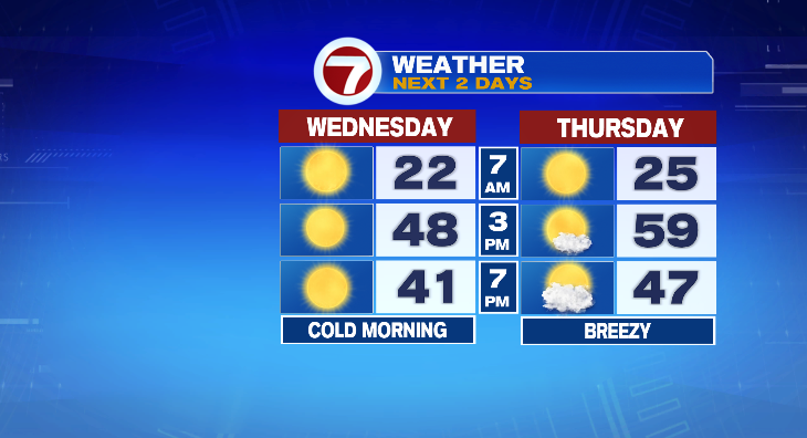 First, we have to get ready for some cold mornings. In fact, overnight into Wednesday we’ll get down to the low 20s. Wow! That’s cold. At least we’ll have sunny skies. Those will help us warm into the upper 40s in the afternoon. It will be even colder on the coast in the afternoon.