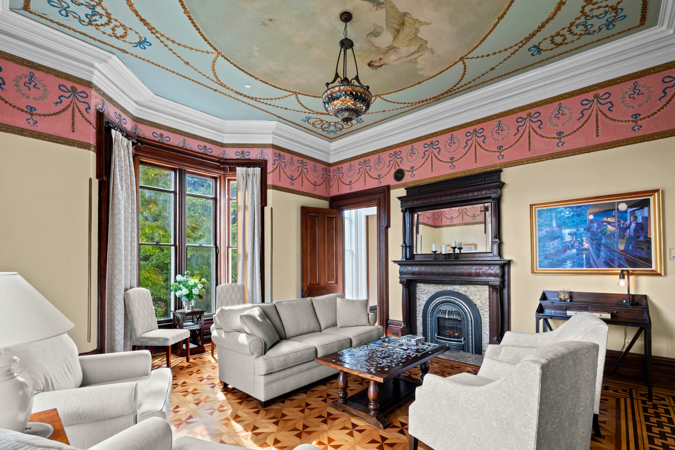During the early 20th century and the Great Depression, the house fell into disrepair and was, for a time, subdivided into apartments. However, accretions of the time, like dropped ceilings and wall-to-wall carpets, protected the beautiful original elements, including walnut parquet flooring and plaster ceiling friezes. They have been carefully restored and today the rooms boast a pleasing combination of classic comfort and historic splendor.
