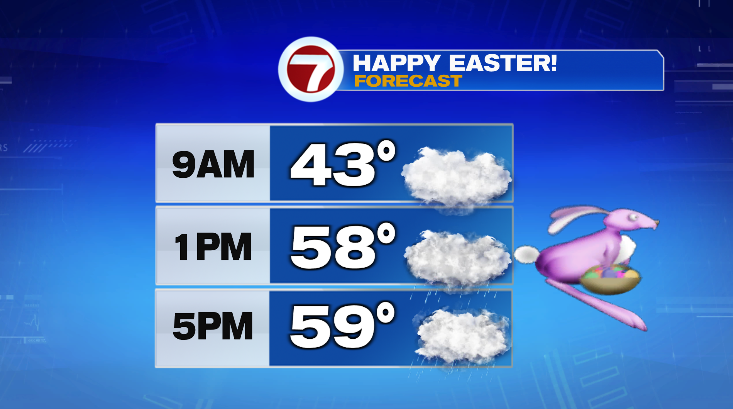 With all this in mind, your best bet for an Easter egg hunt is this morning, before the steadier rain moves in. Temperatures will start in the 40s this morning, but will be in the mid to upper 50s this afternoon. A few spots could even reach 60– mild for this time of year.