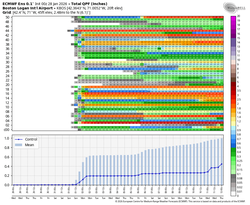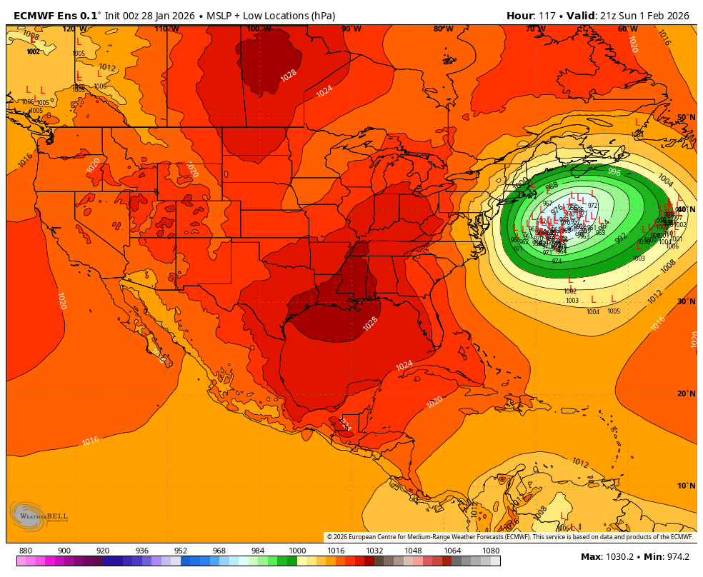 If the high over Canada is established far enough south and strong enough, it can suppress the storm south of us and not allow much of an impact here. However, if the low tracks just south of Nantucket, then it’s game on for a full on snow storm again, this time with even stronger winds/coastal flooding. Getting into the weeds of forecasting here, but you can see on this ensemble view (many different model simulations), the bunch of Ls (strong low pressure) just to our south, and then about half of them, well south and east and far enough away that precip wouldn’t make it in here.