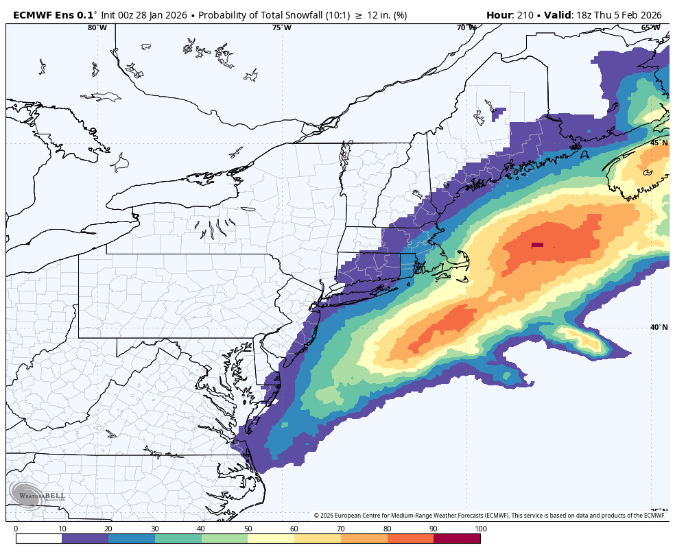 The closer to the storm, the higher the risk of heavy snow and stronger winds. Below shows where the highest risk of 12″+ of snow is. It’s not a lock by any stretch, just a probability map showing the risks.