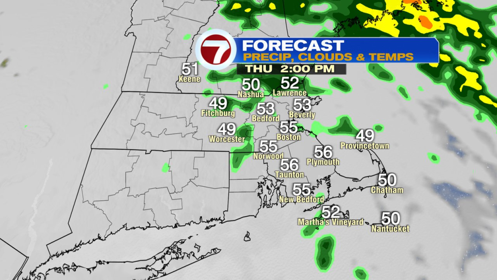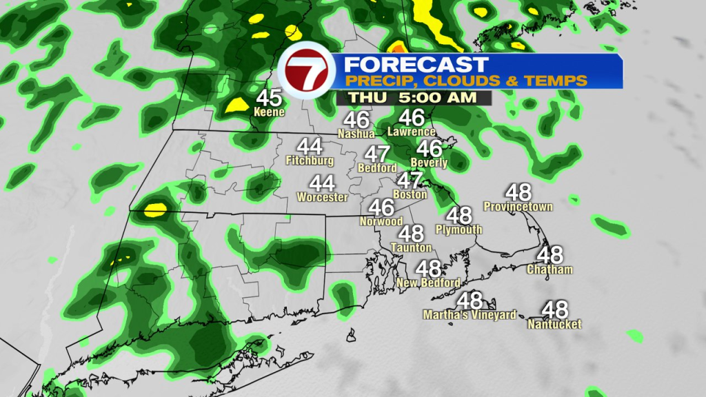 This morning, thanks to clouds that have moved in, temps aren’t as cool as the past couple of mornings as we start in the low to mid 40s. Those clouds hang toughest today along the coast and that, combined with an onshore breeze, will hold temps down into the upper 40s to low 50s there. MetroWest nears 60 with some sun and west of 495 will head into the low to mid 60s with brighter skies and less of an ocean influence.