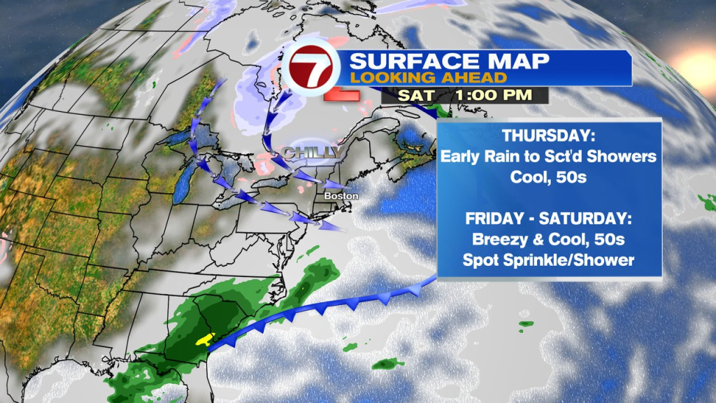 Temps Friday, through the weekend run in the mid to upper 50s. While much of that time frame looks dry, there are a couple things to watch. First, the air aloft Friday into Saturday will be quite chilly. That’ll provide an opportunity for an instability pop-up shower or a sprinkle. The second item to take a look at is a developing wave of low pressure to our south that may scrape our area. that provides a chance for some showers late overnight/early Sunday AM across far Southeast Mass. The bulk of Sunday still looks dry, including for the Walk For Hunger in Boston.