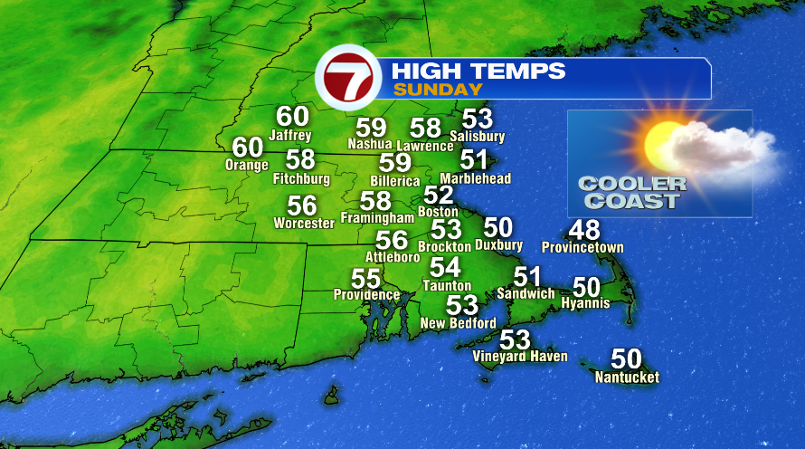 Sunday is a little better. It’s bright and a little warmer, though the coastline will remain cooler than the rest on Sunday, climbing to about 50° once again.