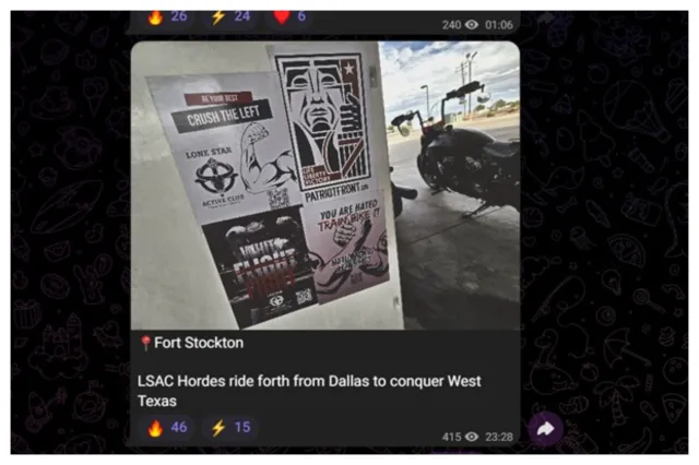 A Telegram post shared by the Lone Star Active Club showed members of the group had put up posters advertising the group on a wall in Fort Stockton, Texas promising to “crush the left.”