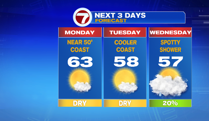 Clouds continue to decrease for everybody as we head into Monday, leaving the start of the week mostly sunny. We’ll still be in the upper 40s and low 50s for the coast, and lower 60s inland. It’ll be a great day to get outside, even if it’s just for a coffee walk on your break or after work.