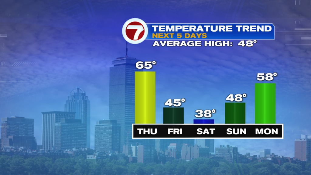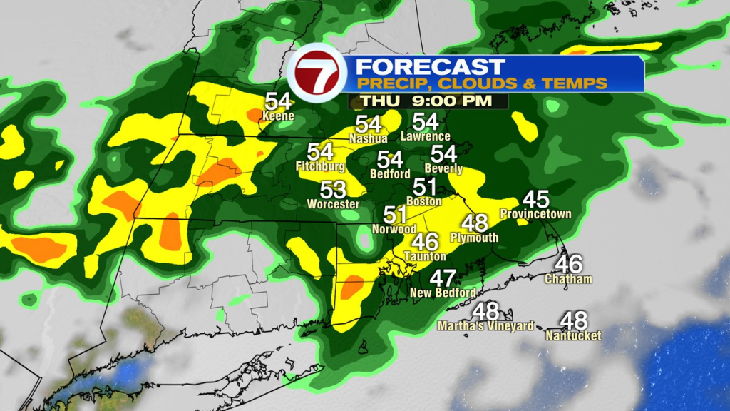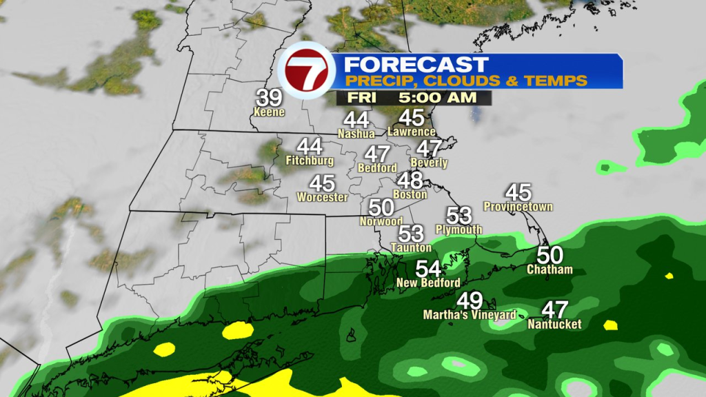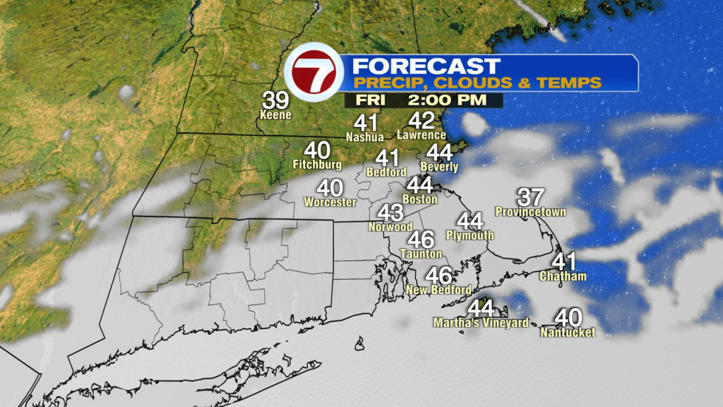 More rain moves through tonight with temps in the 50s this evening. Those temps slide back into the 40s by daybreak tomorrow as rain moves off the south coast by 7am. That’ll leave much of Friday dry with a chilly breeze and some returning sun.