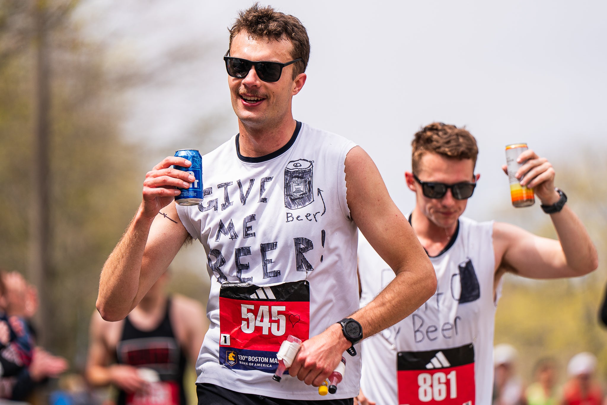 While not dressed up, these runners had a very specific request broadcasted on their shirts: beers.