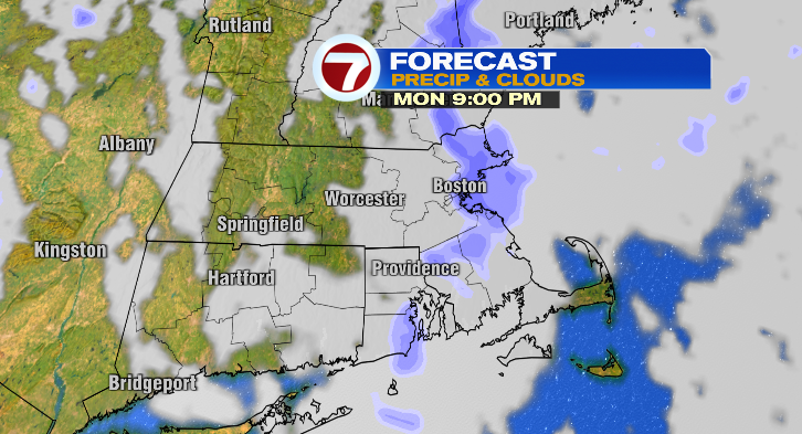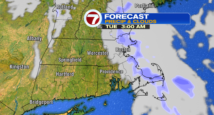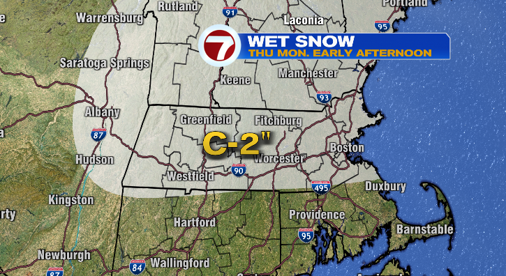 Early Monday morning we’ll make the switch to a wet snow first across northern Massachusetts and southern New Hampshire. As the morning progresses, that rain/snow line will slowly advance south to just south of the Mass Pike between 7-10 a.m. The farther south you are, the more you’ll stick with plain rain.