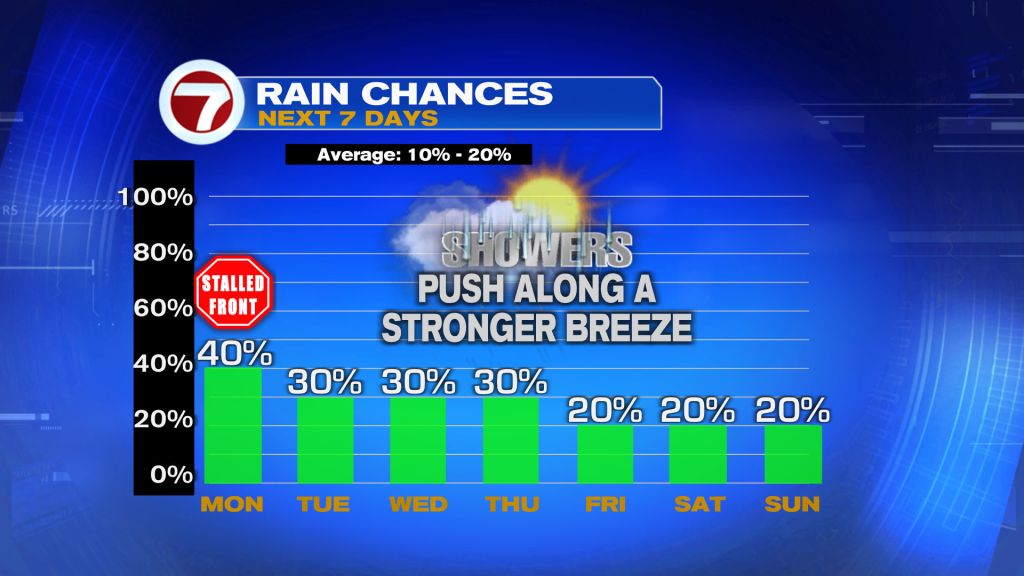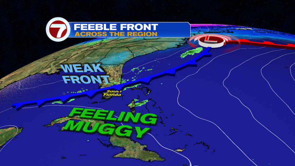The instability is the result of warm and humid air merging with a Florida Front. The Cold Front has been slowly sagging south. There’s really no cooling coming with it (just the drop of about 5-degrees) and the boundary is forecast to dissipate over the next 24-hours. For Sunday, it’s the same type of weather setup with clouds increasing, mainly late-day, along with areas of rain that pop up.