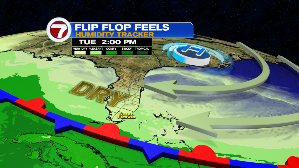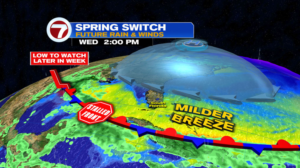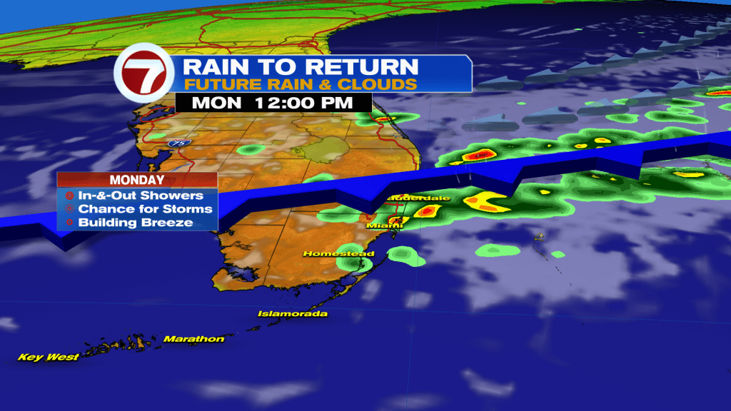 Rain chances will turn higher come Monday — the day when the front actually crosses through South Florida. Therefore, expect in-and-out, passing showers and storms that will be scattered in nature.