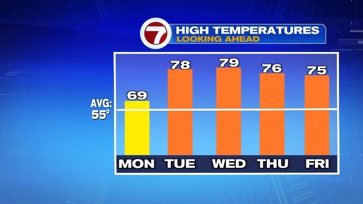 The more prevalent part of the next week will be the warmth! High temperatures will be 20 degrees above average on Tuesday, Wednesday and Thursday (highs in the mid to upper 70s). Even Friday will be quite warm for this time of year, with highs topping out in the low 70s.