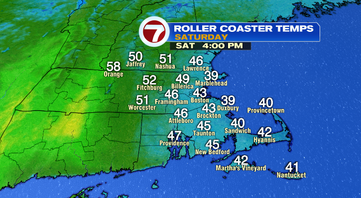 So what’s the deal? We have what we call a back-door cold front (basically think of a cold front that moves backwards– east to west instead of west to east) moving in throughout the day. That will have temperatures falling, along the coast first and then inland, as we head through the afternoon. Expect widespread 40s by 2-3 PM or so, and temperatures in the upper 30s in the evening!