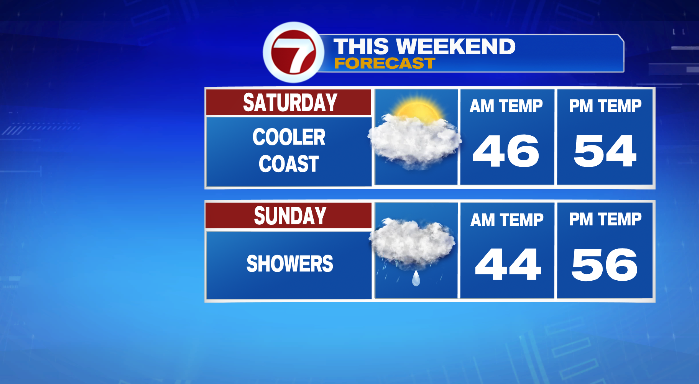 Let’s start with this: overnight, we’ll be partly cloudy with temperatures in the mid 40s to low 50s– mild for this time of year. Saturday will start with a mix of sun & clouds, but get progressively cloudier through the morning. The remainder of the day will be mostly cloudy and breezy (gusts in the 20s), but dry. Highs will be seasonable in the mid 50s inland. It’ll be much cooler for the coast, with highs stuck in the 40s.