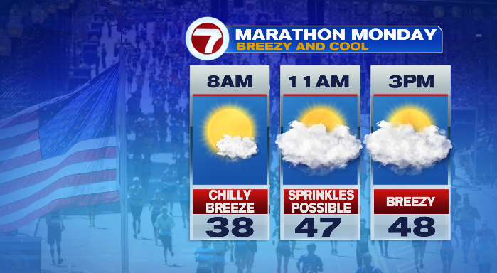 Now for the big ticket item: Marathon Monday. Once again, this forecast isn’t picture-perfect, but I’d say it certainly favors the runners. We’ll be in and out of the clouds throughout the day, and it will still be quite breezy. Temperatures will start chilly– we’ll wake up in the mid to upper 30s– and we’ll stay below-average with highs in the upper 40s. We could see a stray shower, though most of the day will stay dry. Again, for the runners it’s not bad– no need to worry about beating the heat as you head up Heartbreak Hill. As for the spectators (like yours truly), make sure you’re layered up heading out to the race course! It’ll be a raw, early-spring feel.