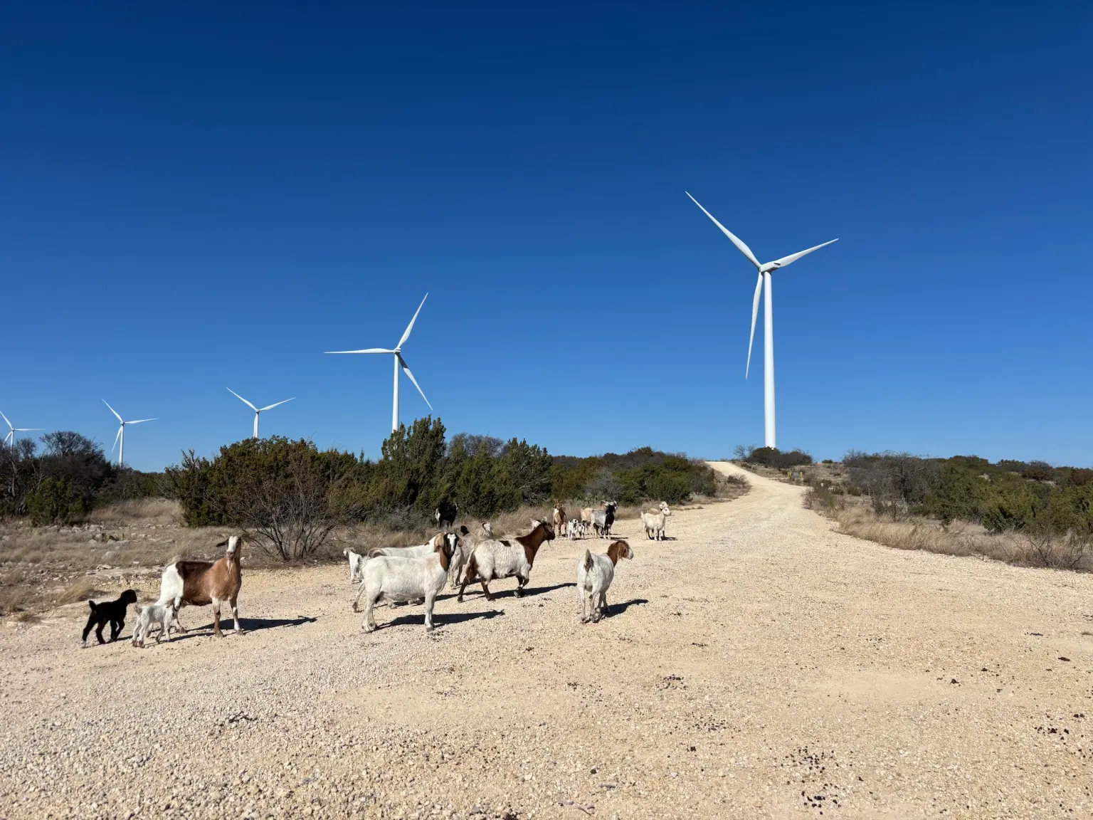 On an unseasonably warm January day, Duff Hallman’s goats and sheep wandered unhurried through the rocky hills of his ranch 30 miles south of San Angelo, Texas, unbothered by the long shadows that swept over the ground. The shadows fell from wind turbines towering 250 feet above, their blades spinning like clock hands over land that has been in Hallman’s family for four generations. From a shady spot in his backyard, Hallman can almost nod off watching them turn. “It slows your pace down a bit,” he said.