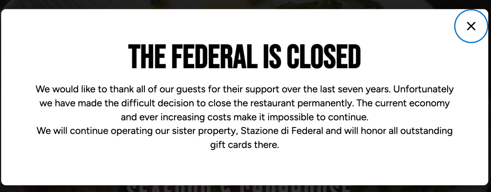 In a message posted to its website, The Federal thanked customers for their support and said, “the current economy and ever increasing costs make it impossible to continue.” The restaurant added that its sister property, Stazione di Federal, will remain open and honor all outstanding gift cards.