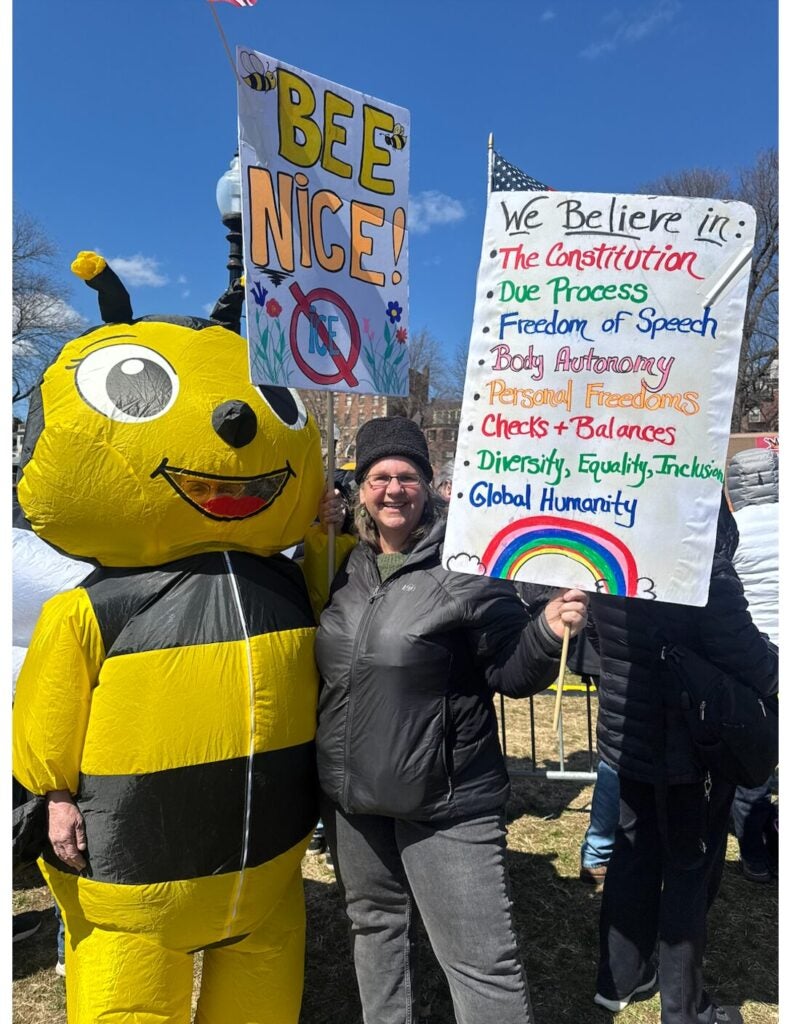 Donna Farrell wore an inflatable bumblebee costume with a simple message: “Be[e] nice.”