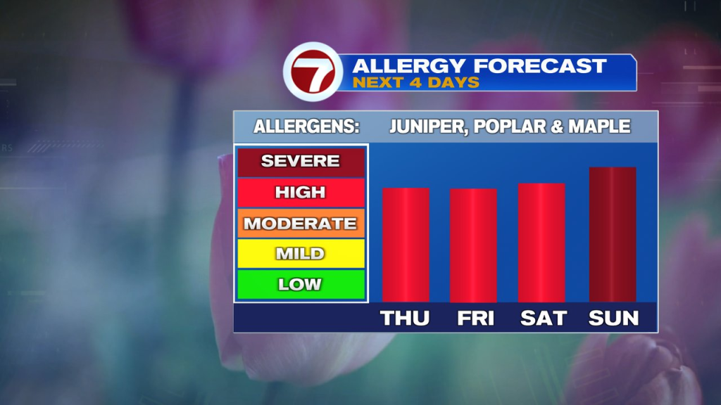 Pollen counts will be high through the weekend into early next week. Early next week looks warm, near 70 Monday, then in the 70s to near 80 on Tuesday. The Spring growth/green up should really start to kick into gear over the next week or two.