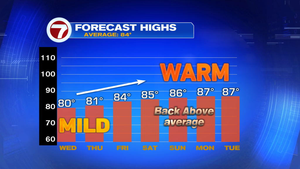 Temperatures, during the rest of the midweek, will continue to feel pleasant. Realize that we typically have highs in the mid 80’s so this is still considered mild.
