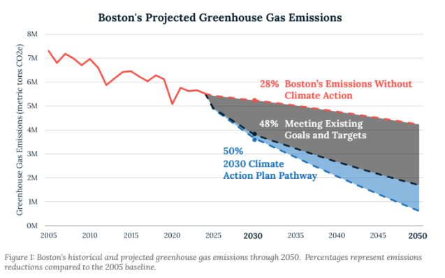 As of 2024, Boston’s emissions had fallen by 26.7 percent compared to 2005, something officials say reflects real progress. But the goal of reducing greenhouse gas emissions by 50 percent by 2030 could still be viewed as ambitious.